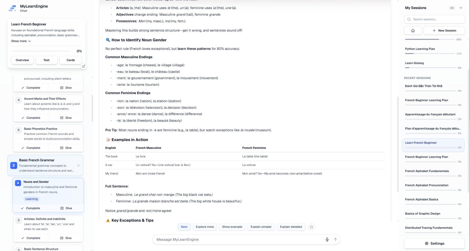 Pronunciation is where most beginners struggle, and where an AI French learning app genuinely helps. Instead of passively reading rules, you can ask your AI tutor to explain exactly why French nasal vowels sound the way they do, request example sentences, or have the AI break down liaisons step by step. Interactive French learning means you get answers when confusion arises — not at the next class.